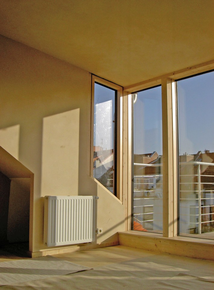 baujahr 2006 bremen / dacherneuerung mit 22cm cellulosedämmung / innenverschalung osb-platten mit gipsfaserplatten / lehmfeinputz / bodendielen hainbuche / velfac fenster /